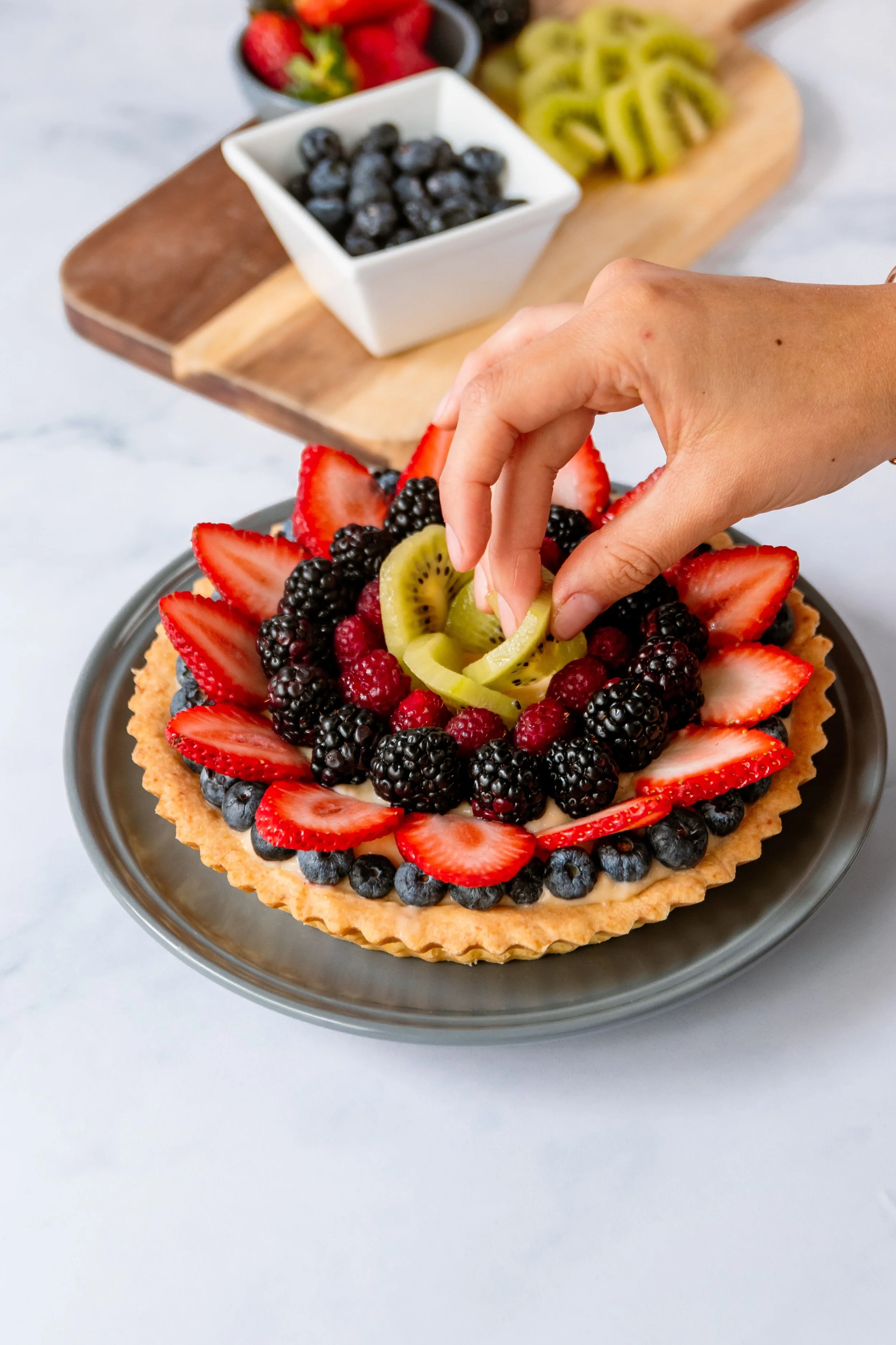 Add fresh fruit and apply glaze while still half-frozen. This keeps fruit looking fresh and extends shelf life up to 4 days.